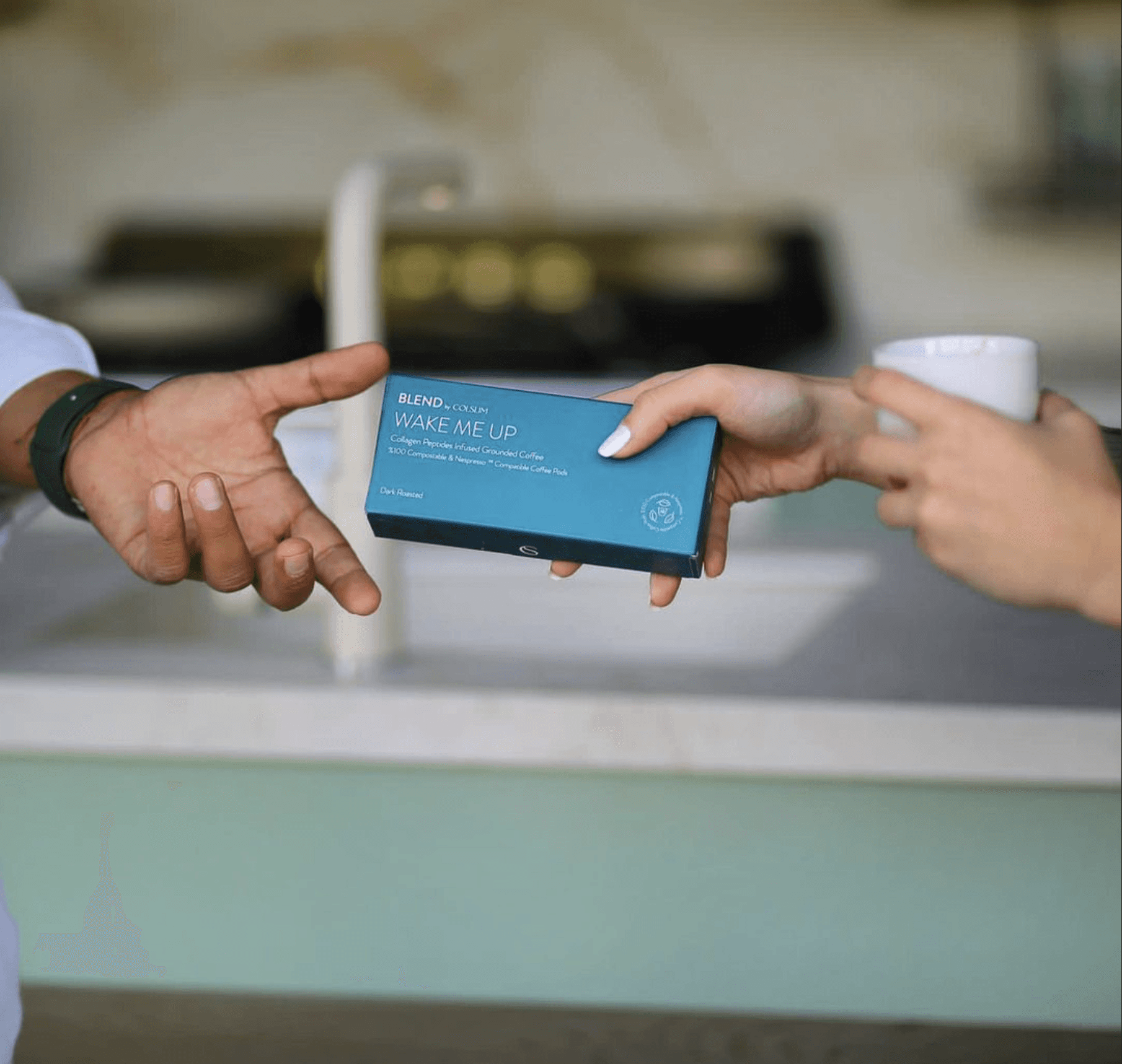 Brand identity design for a collagen-infused coffee capsule, blending lifestyle appeal with scientific clarity.